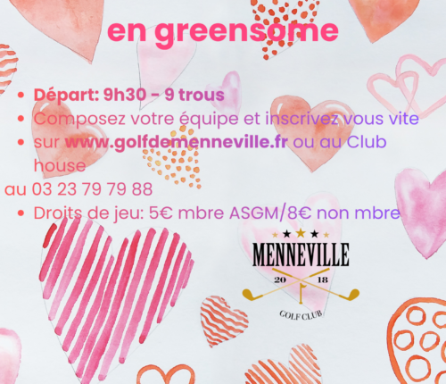 Venez Fêter la Saint Valentin au Golf de Menneville lors de cette édition 2026 Formule Greensomme Départ à 9h30 pour 9 trous Suivie d’un repas t...